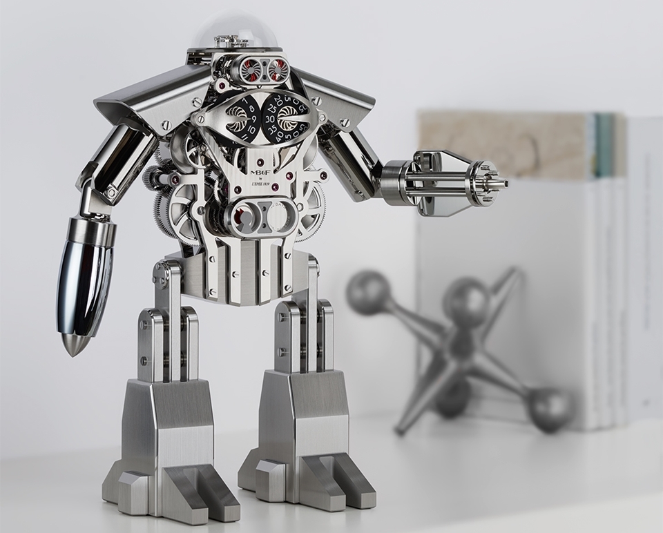MB&F is well-known for ornate, complicated, and elaborate timepieces that look like intricate machinery fit for the kind of giant robots that aliens will use to invade the planet and enslave mankind. Well, MB&F probably noticed it, too, so they built the MB&F Melchior, a desk clock that also happens to be an articulated robot figure.