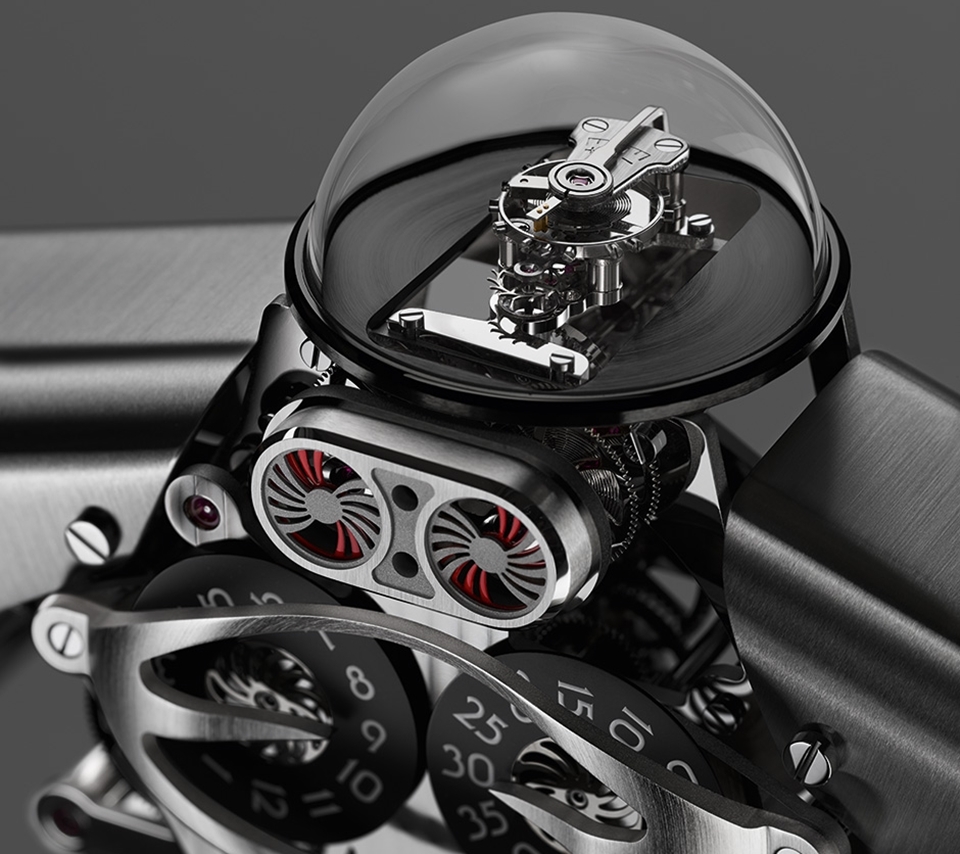 Created in conjunction with high-end Swiss clock manufacturer L’Epee 1839, the clock, naturally, bears the kind of complicated movement we’ve been used to seeing from MB&F’s timepieces. As with their watches, most of the machination is openly exposed, allowing you to admire the 480-component mechanical movement.
